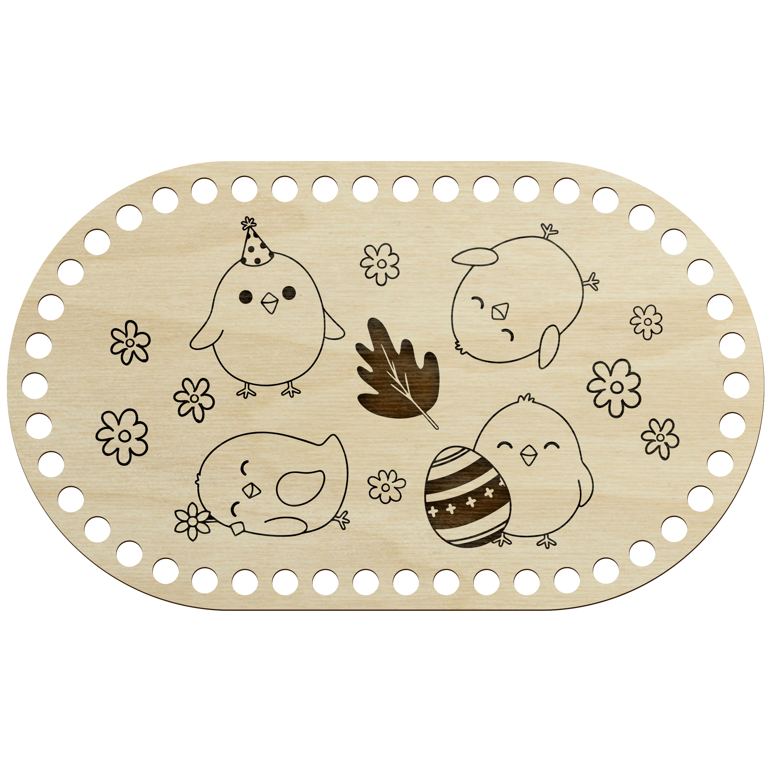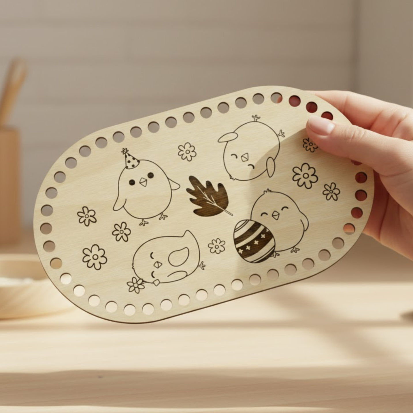 Drewniana baza wielkanocna do szydełkowania w kształcie owalu to idealna podstawa do tworzenia drobnych, ręcznie robionych dekoracji świątecznych. Naturalne drewno i precyzyjne wycięcia sprawiają, że praca z nią jest łatwa i przyjemna.