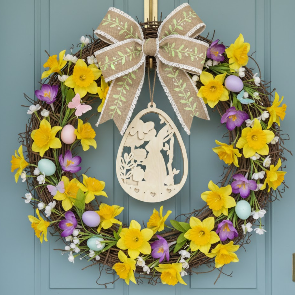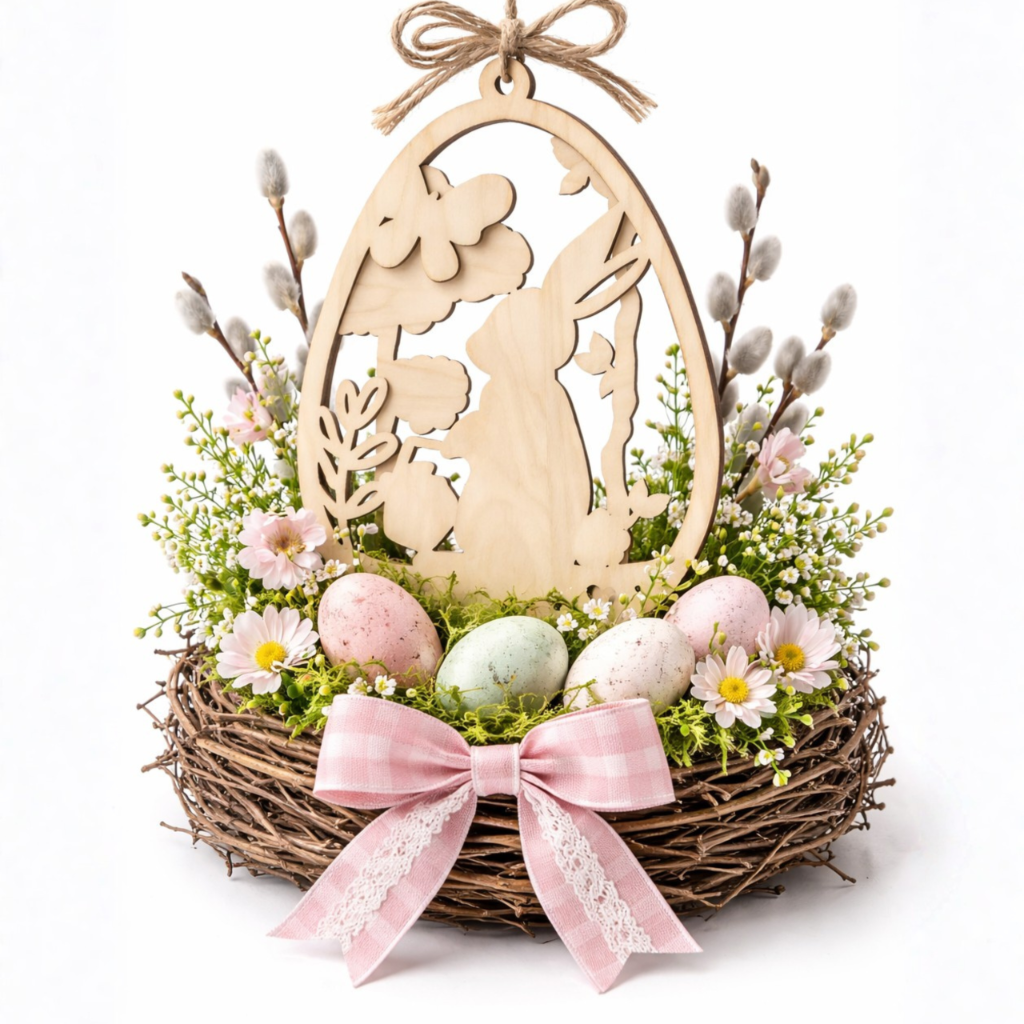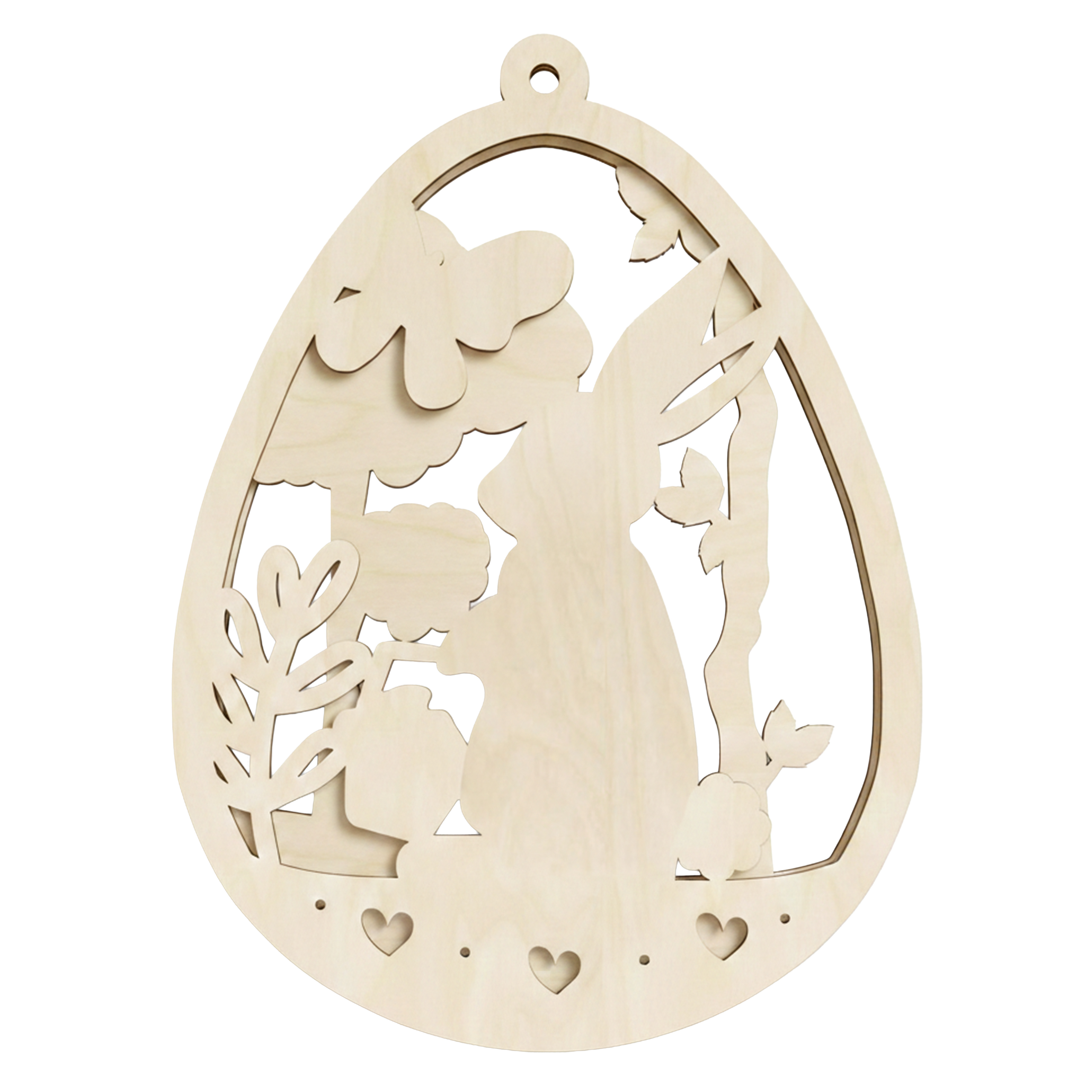 Ta zawieszka wykonana jest z dwuwarstwowej, naturalnej sklejki brzozowej, co nadaje jej wyjątkowego charakteru i trwałości. Lekka, elegancka i pełna szczegółów, doskonale wpasuje się w wiosenne i świąteczne aranżacje – od stołu po okna i dekoracje domowe. To również świetny pomysł na prezent wielkanocny, który zachwyci każdego!