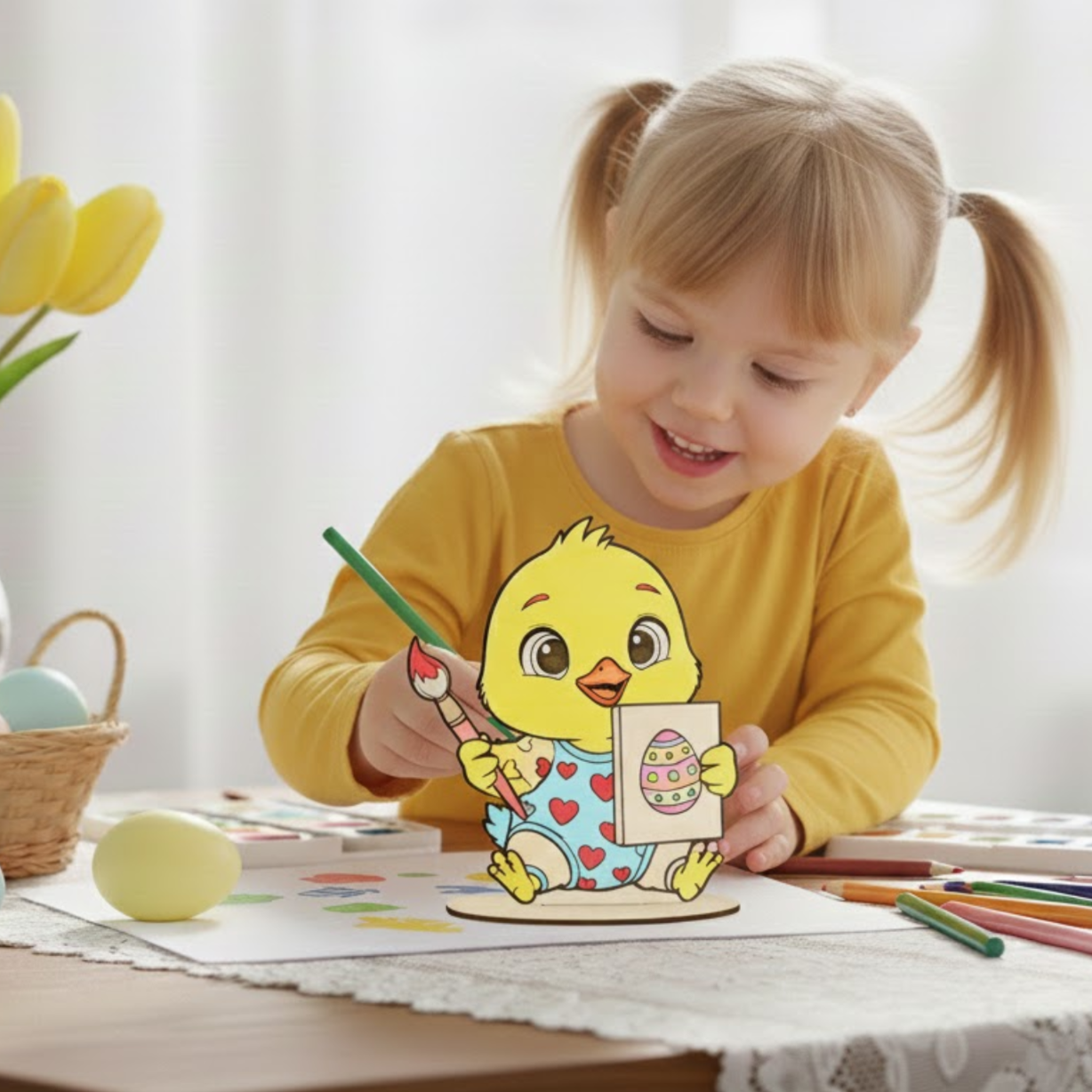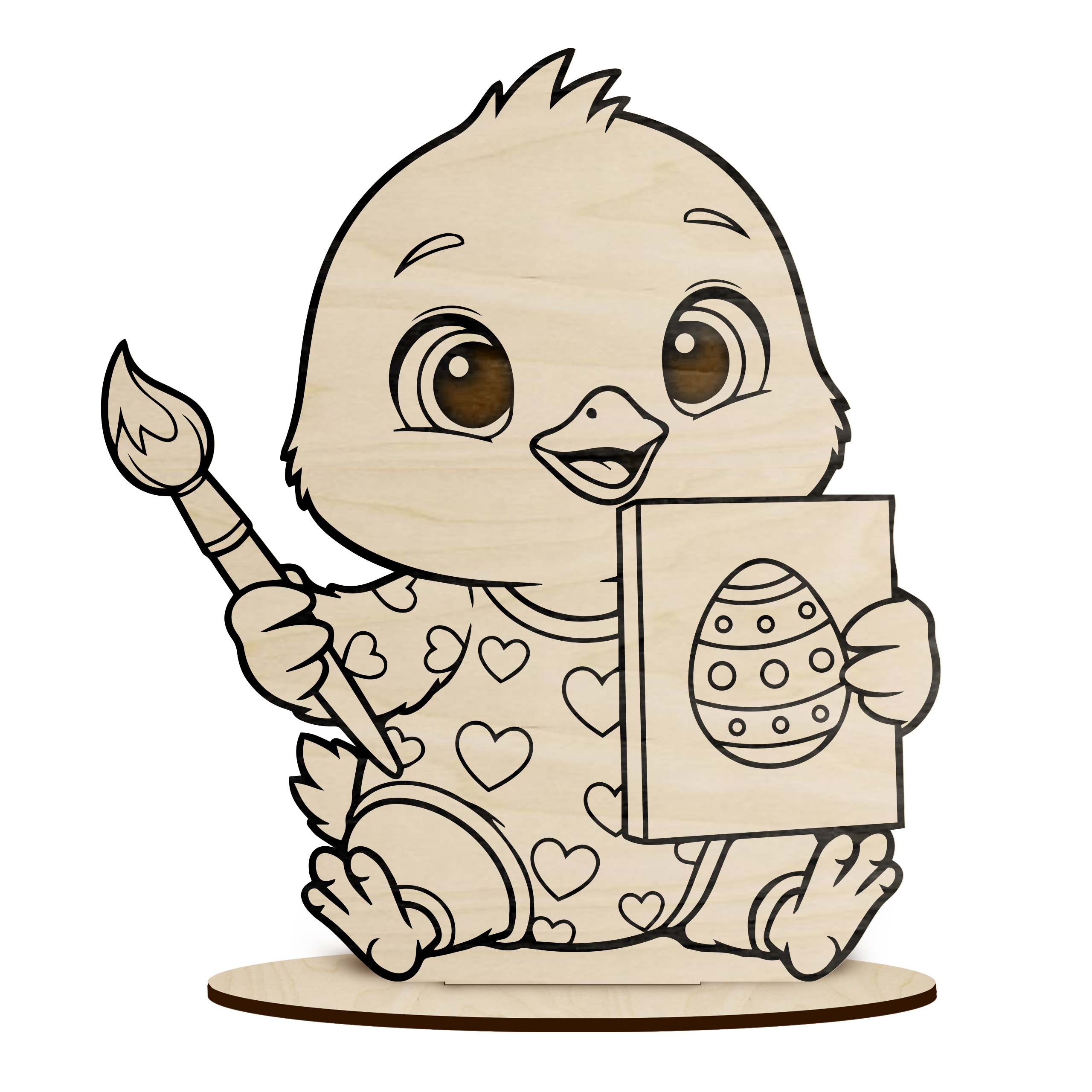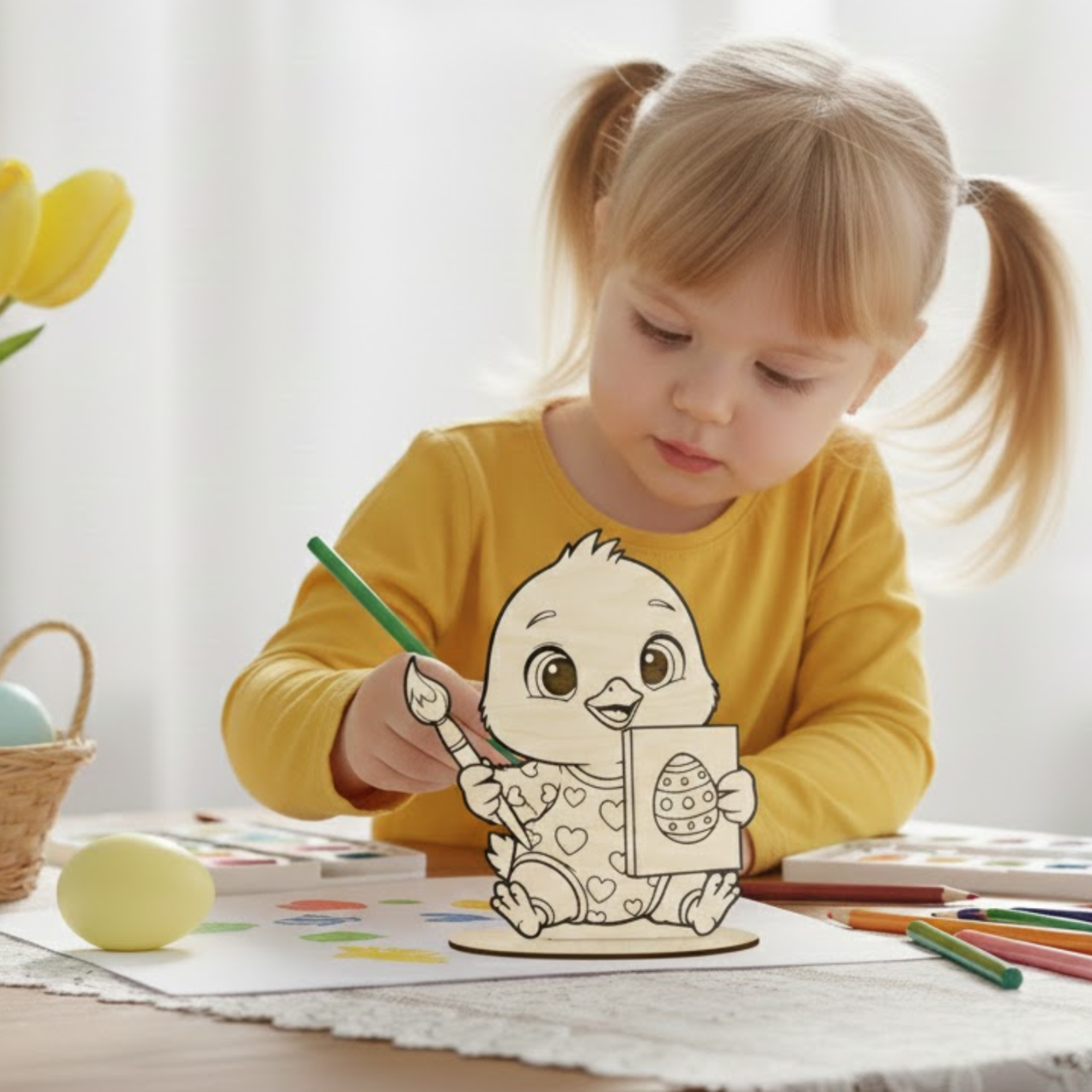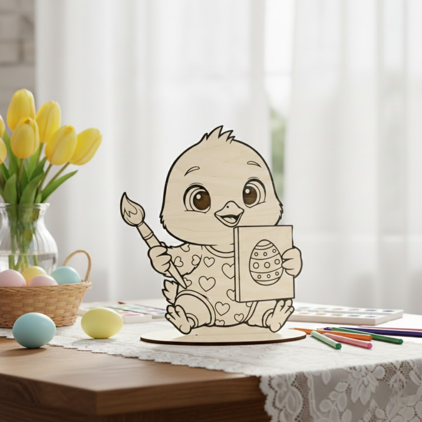 Drewniana figurka kurczaka wielkanocnego ze sklejki brzozowej to idealna baza do malowania, kolorowania i dekorowania. Świetnie sprawdzi się w koszyczkach wielkanocnych, stroikach świątecznych czy projektach DIY, wprowadzając świąteczny nastrój do Twojego domu.