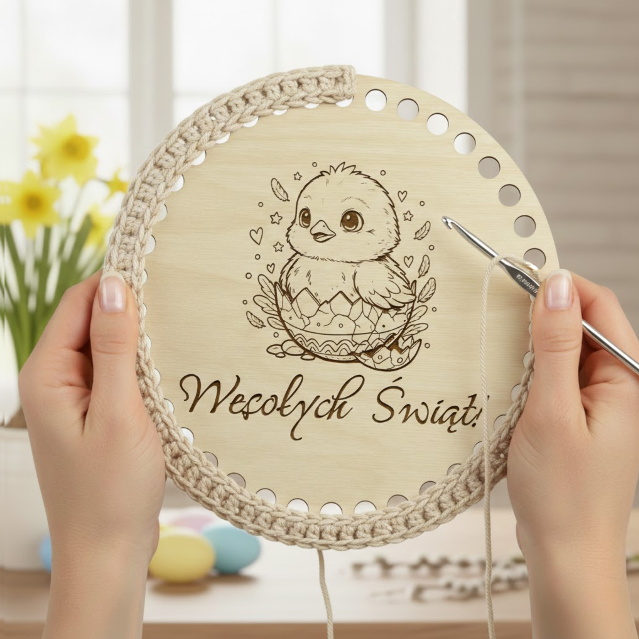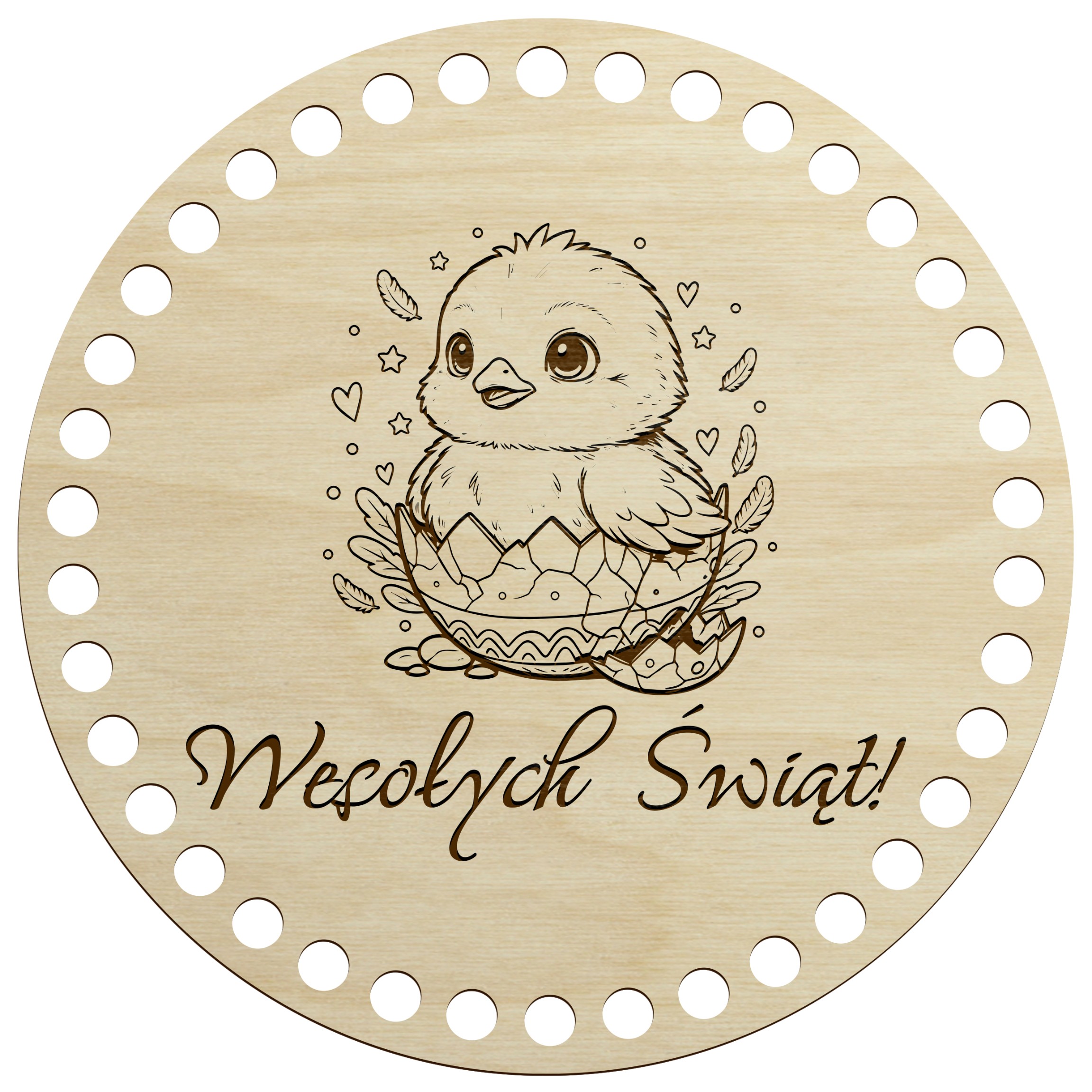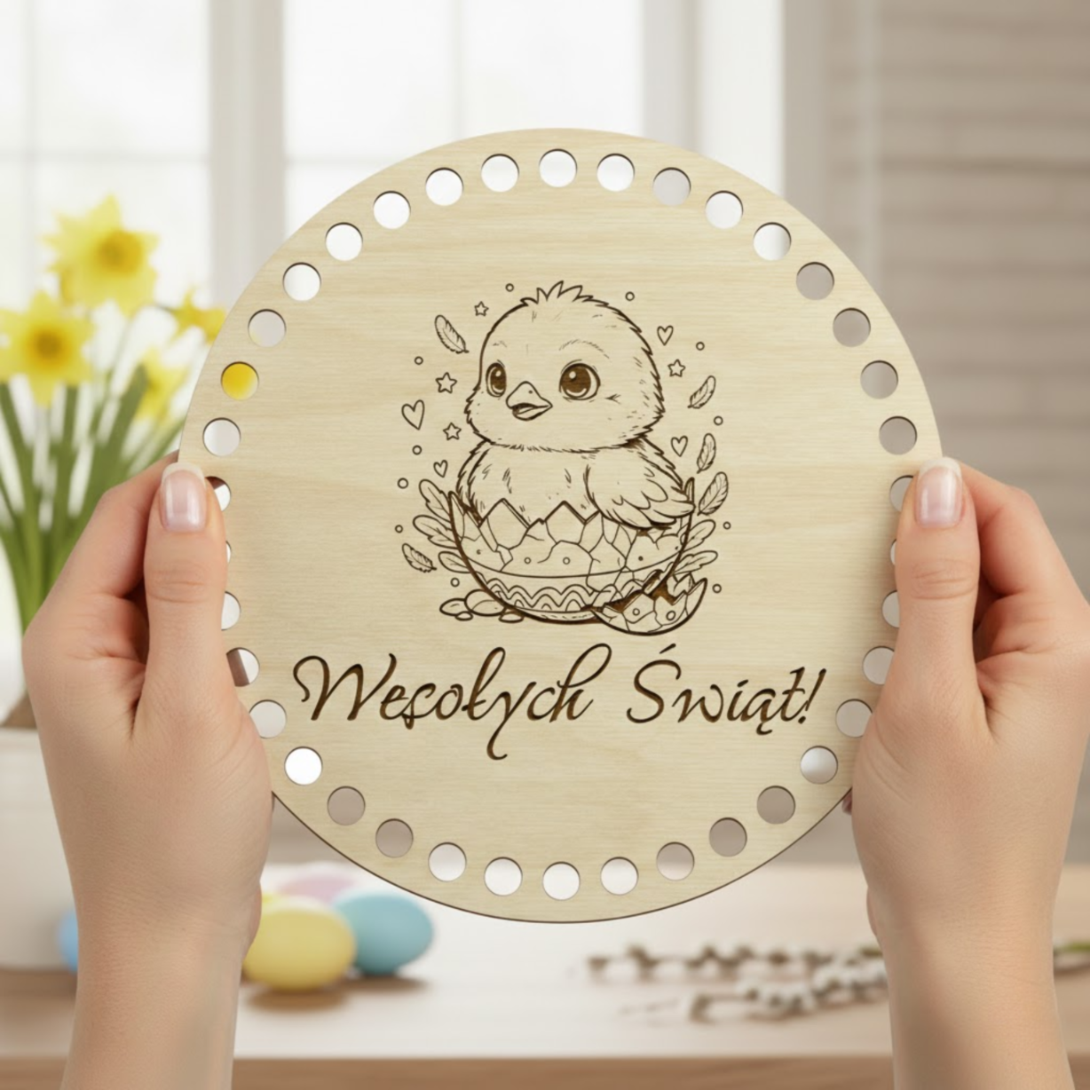Drewniana baza wielkanocna do szydełkowania w kształcie okręgu to idealna podstawa do tworzenia drobnych, ręcznie robionych dekoracji świątecznych. Naturalne drewno i precyzyjne wycięcia sprawiają, że praca z nią jest łatwa i przyjemna.