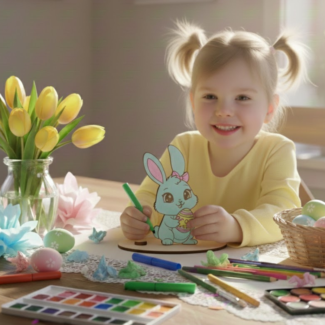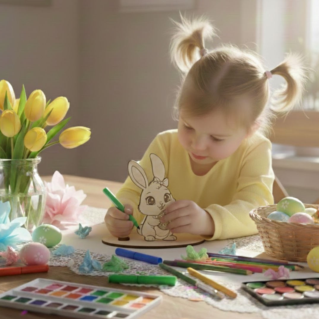Drewniana figurka króliczka wielkanocnego ze sklejki brzozowej to idealna baza do malowania, kolorowania i dekorowania. Świetnie sprawdzi się w koszyczkach wielkanocnych, stroikach świątecznych czy projektach DIY, wprowadzając świąteczny nastrój do Twojego domu.